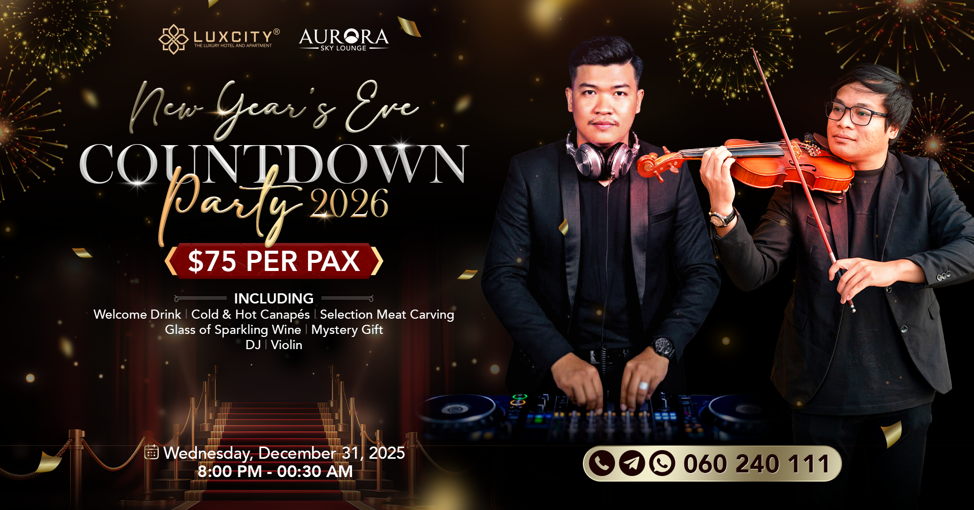 Enhance your New Year’s experience by booking a stay at Luxcity Hotel & Apartment. Book on December 31, 2025, and receive a 20% discount on your event tickets. Enjoy luxurious accommodations, convenient access to Aurora Sky Lounge, and a seamless celebration experience.