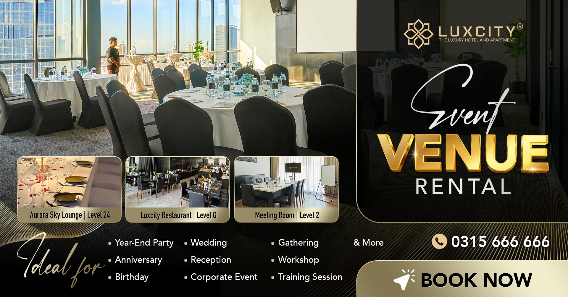 Luxcity Restaurant on the ground floor combines exquisite cuisine with a stylish ambiance, perfect for dinners and receptions. Each space is equipped with modern amenities to ensure a seamless event experience.