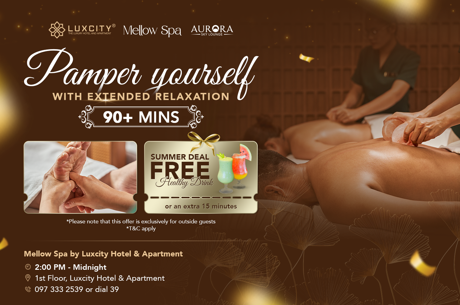Mellow Spa by Luxcity Hotel & Apartment is excited to offer an exclusive promotion for guests who want to unwind and stay refreshed. When you book a spa session of 90 minutes or more, you’ll receive a coupon for a free healthy drink at Aurora Sky Lounge, located on the 24th floor of Luxcity Hotel & Apartment. This deal is your ticket to feeling renewed both inside and out.