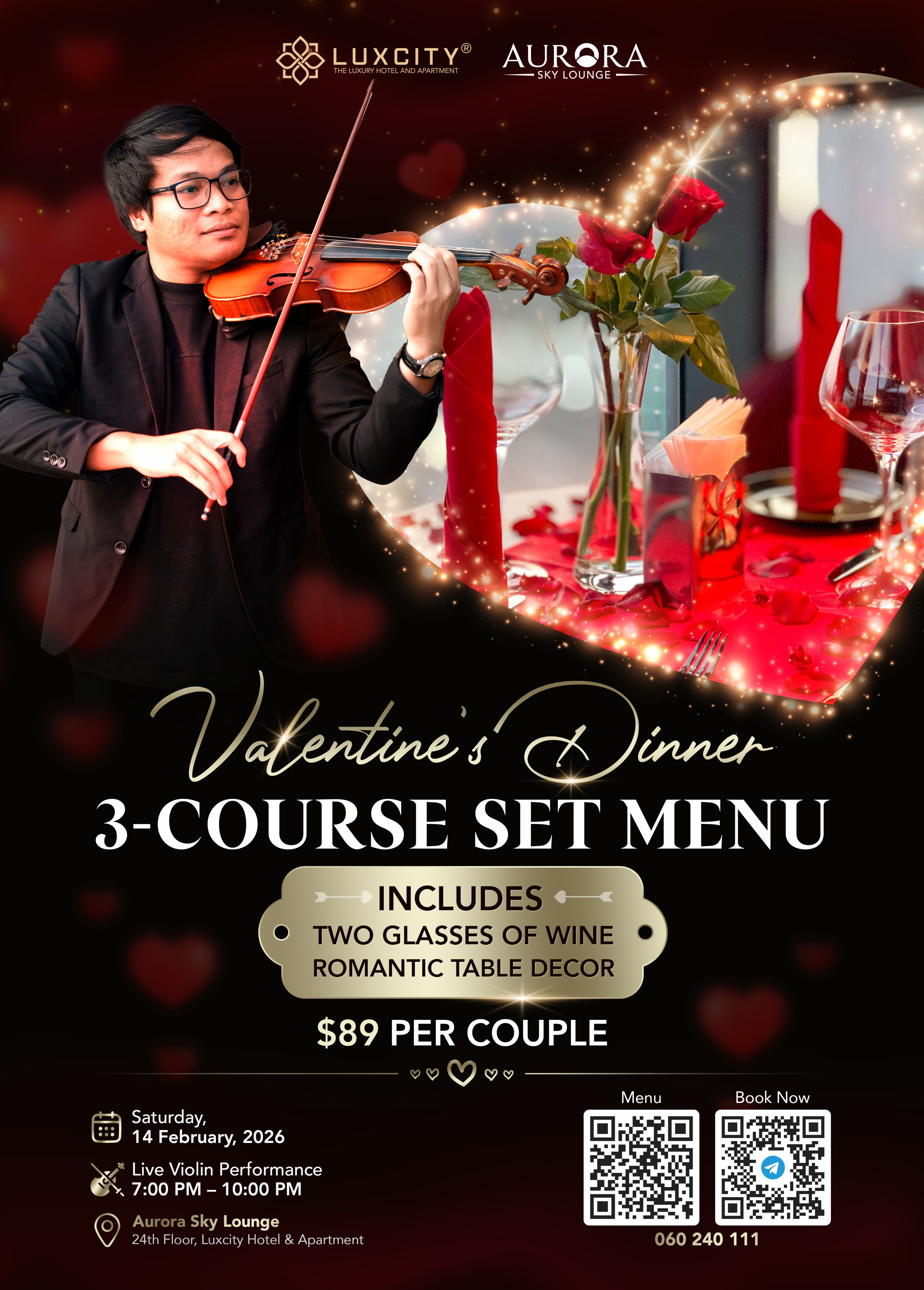 Make this Valentine's Day special at Aurora Sky Lounge with a romantic 3-course set menu, including vegetarian options. For $89 per couple, enjoy two glasses of wine and beautifully decorated tables in a cozy, elegant setting. From 7:00 PM to 10:00 PM, experience live violin performances that set the perfect mood. Whether you're celebrating with a loved one or a special someone, this exclusive evening promises unforgettable moments. Book now to create lasting memories under the stars with fine dining and live music.